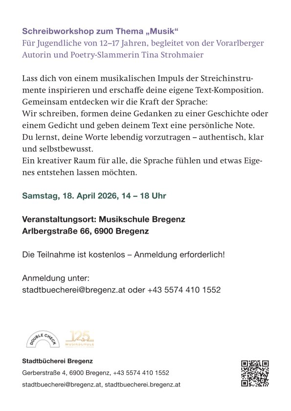 18 Apr 26: Schreibworkshop zum Thema „Musik“ (von 12-17 Jahren). Bregenz, Musikschule. Melde dich per E-Mail an: stadtbuecherei@bregenz.at. Mit Auftrittsmöglichkeit am 19 Mai. Workshopleitung. Wurde leider abgesagt.